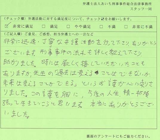 しかし粘り強く交渉を重ね、被害者家族に接触しない等の条件を付すことで、被害者に納得していただく事ができ、何とか勾留期間中に示談を締結することができ、Aさんは不起訴となりました。